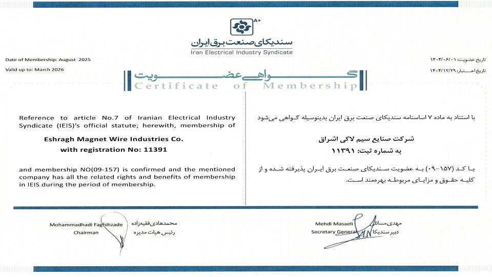 صنایع سیم لاکی اشراق در تاریخ 1 شهریور 1404 به عضویت سندیکای صنعت برق ایران درآمد.