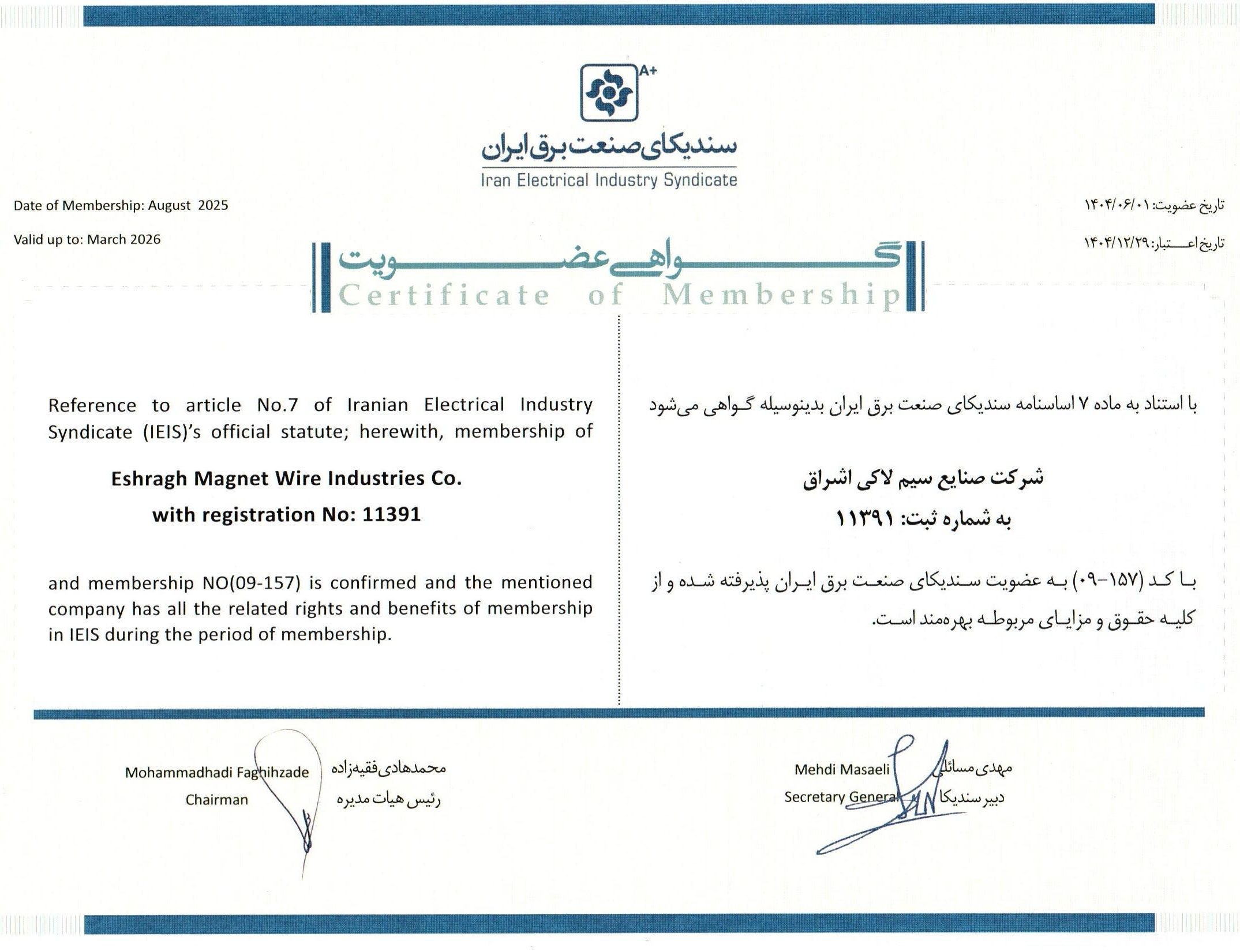 گواهی عضویت در سندیکای صنعت برق ایران